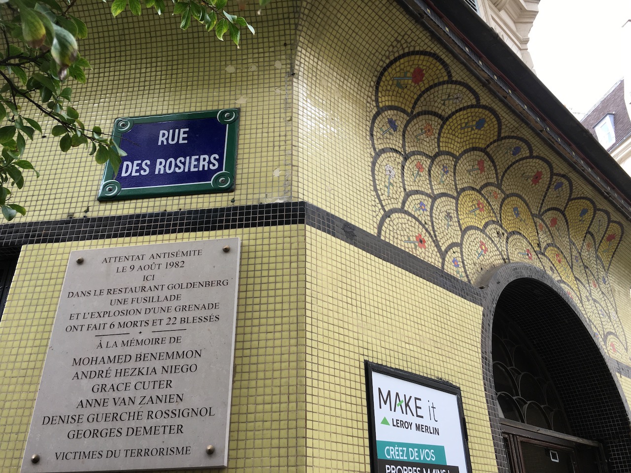 16/ Le quartier juifs: La présence de la communauté juive est ancienne, liée aux aléas politiques (ordonnances d’expulsion des Juifs de France de Philippe IV le Bel en 1306 et de Charles VI en 1394) qui provoquent afflux et reflux des populations. Fin XIXème siècle et début XXème siècle, entre 1881 et 1914, le quartier accueille une forte immigration : environ 20 000 personnes s’implantent dans le quartier, après avoir fui les persécutions en Roumanie, Autriche Hongrie et Russie. La communauté ashkénaze, yiddishophone, est ainsi fortement représentée, expliquant la forte image du Pletzl au XXème siècle, mais des recherches récentes montrent que la communauté séfarade est aussi présente. En 1982, un attentat fait six morts et vingt-deux blessés dans le restaurant Goldenberg situé au no 7 de la rue. En 2011, la justice française identifie le Fatah Conseil révolutionnaire d’Abou Nidal comme responsable de l’attentat.