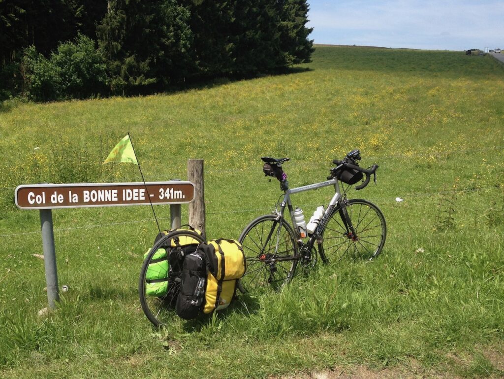 Ce qui est chouette en cette saison et dans ces coins-là, c’est que le matin, il n’y a pas de rosée et donc je peux plier une tente bien sèche. A la sortie de Givet, j’attaque ma 1ère longue grimpette, plus de 4km, que je monte facilement à mon rythme. Dommage, le  col que je passe n’a pas de nom.  Au village de Felenne, un monsieur me confirme qu’il n’a pas de nom et que des courses cyclistes y passent de temps en temps. Quelques autres montées et longues descentes m’attendent ensuite jusqu’au village des Hautes Rivières. J’achète dans une boulangerie mon pique-nique mais continu le long de la Semois jusqu’au village belge de Bohan. Le site est touristique visiblement car il y a de nombreux bars et restaurants. La tentation est trop forte et je me paye donc une bonne bière dans un bar qui, détail amusant, fait aussi salon de coiffure. Je profite aussi du wifi avant d’aller déjeuner au bord de la rivière, sous les yeux affamés de quelques canards. L’après-midi se passera entre France et Belgique, sur de toutes petites routes sans trafic avec encore pas mal de dénivelés. Je passe par le col de la Bonne Idée, 341m puis par celui du Morthéan, 433m. La traversée de la forêt de Sedan est particulièrement calme. Les villages suivant sont sans aucun commerce ni camping. J’en repère un avec les Pages Jaunes à Matton et Clémency. C’est un camping de luxe, chaque parcelle ayant ses sanitaires. Il y a aussi un grand restaurant. L’accueil n’est pas encore ouvert et je n’ai pas envie d’attendre ni de dépenser 23€ juste pour planter ma tente. J’y fais donc mon plein d’eau et notamment d’eau chaude dans ma poche à eau et continue le long de la petite route qui se transforme vite en piste à la recherche d’un endroit où bivouaquer. Je le trouve assez rapidement sous les arbres dans un endroit où je ne croiserais personne jusqu’au lendemain. J’ai le luxe de pouvoir prendre une douche chaude, limite brulante,  et d’être tranquille, seulement dérangé par quelques moustiques. Dîner à base de soupe marocaine lyophilisée et de nouilles chinoises.