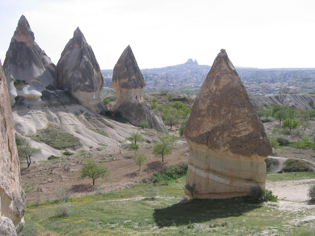salade, viande de veau cuite au barbecue, feuilleté au fromage) et la reprise toujours un peu difficile ? Nous visitons ensuite la citadelle d’Uçhisar, vaste bloc rocheux que l’on escalade par l’intérieur puis l’extérieur. De là, on a une vue sur toute la Cappadoce qui, pour sa partie la plus spectaculaire, n’est pas si étendue que cela. Nous descendons ensuite dans la vallée blanche aussi appelée vallée de l’Amour ou vallée des zizis (voir pourquoi sur la photo). Le paysage est vraiment extraordinaire. Ce qui est appréciable dans le programme de ce voyage est qu’il y a une progression vers la découverte d’endroit toujours plus beau. Les premiers jours nous paraissent après coup un peu décevant mais ils sont oubliés par ce que nous voyons à présent. A ce rythme là, demain matin, notre dernière balade devrait être un feu d’artifice. Retour à notre hôtel des 2ème et 3ème jour directement par
