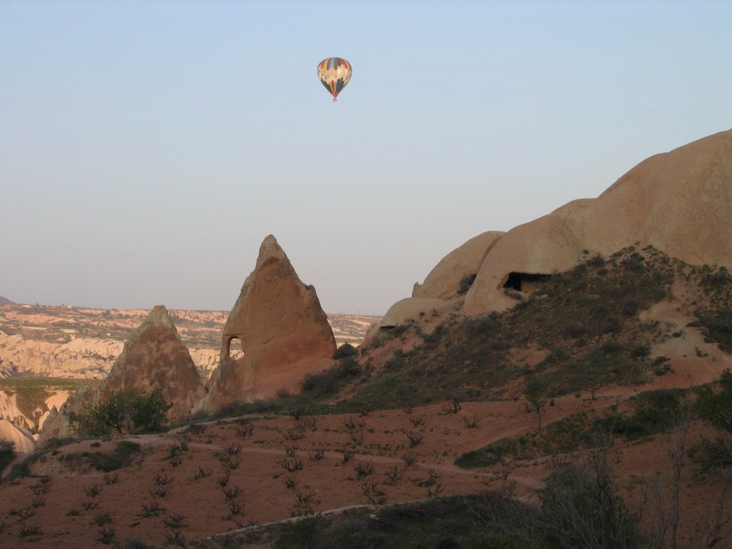 Notre réveil est très matinal. Tout d’abord parce qu’il fait jour à 6h et qu’il n’y a pas de volet aux chambres et aussi parce que les nombreuses montgolfières qui décollent très tôt pour profiter de l’absence de vent font du bruit avec leurs brûleurs. Mais cela vaut le coup d’œil. On se renseignera le soir même mais les 120 euros demandés pour une heure de vol sont trop chers pour nous. Le petit déjeuner typique de Turquie est composé d’un peu de charcuterie, fromage, tomate, concombre, œuf dur, pain et confiture, et bien sur de thé qu’il faut couper avec de l’eau chaude car il est trop concentré.