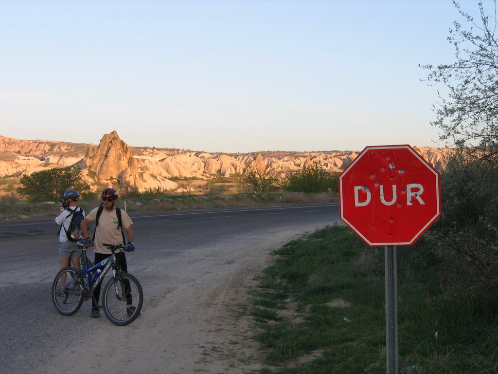 Départ en minibus pour la Cappadoce. Nous quittons Ankara en passant par son périphérique. La circulation est assez fluide bien que un peu chaotique. Il faut jouer du klaxon pour se faire respecter. Notre bus est très poussif notamment dans les cotes. Il lui est interdit de dépasser les 80km/h. Autant dire que les 260 km qui nous sépare de la Cappadoce seront longs. A la sortie d’Ankara, le paysage devient très monotone. Mehmet qui n’est pas avare en informations sur son pays, répond à toutes nos questions. Il est jeune et parle très bien le français. Pause thé au bord du lac Tüz Gölü. Ce lac très étendu est encore bien rempli d’eau mais il s’assèche chaque été pour ne laisser qu’une immense étendue de sel. Pause thé au bord du lac.  Nous nous arrêtons ensuite dans un restaurant situé à Aksaray, à l’embranchement vers la Cappadoce. Très bon repas de pides (sortes de pizzas turques). Les boissons à base de yaourt salé nous plairont que moyennement. Nous reprenons la route, toujours en très mauvais état (nids de poule, bitume défoncé par les camions) pour arriver au village de Çat. Achat de bouteilles d’eau. Nous remontons nos vélos à la sortie du village car nous allons faire notre première balade à vélo. Il fait beau et pas trop chaud. Les vélos ont bien supporté les transferts et les avions. Nous voilà fin prêts pour descendre dans la vallée des pigeonniers, une vallée très peu touristique.  Jolie vallée large et bordée de pigeonniers des 2 cotés. Les pigeonniers étaient surtout utilisés pour récupérer la fiente des oiseaux, un excellent engrais pour les cultures. Le chemin doit traverser plusieurs fois une petite rivière qui serpente. Nous quittons ensuite la vallée pour remonter vers le village de Çat. La vue est chouette sur le volcan Erciyes Dagi (3916m) enneigé puis sur le village de Çat. Le chemin devient ensuite moins intéressant passant par des pistes ou par la route. La piste passe ensuite à coté du d’usine de Raki (cela se sent à l’odeur ambiante) puis de carrières de pierre. A la sortie d’un village, nous nous retrouvons au milieu d’un grand troupeau de moutons. Nous affrontons nos premières crevaisons à cause des épines au sol. Un peu avant d’arriver à Göreme, nous repérons un petit terrain de jeux pour quelques descentes pentues en vélo. Nous ne nous rendons pas compte que Bernard a préféré continuer par la route et a pris la mauvaise direction. Pendant que nous allons à l’hôtel, Memhet avec le bus part à sa recherche. Il est 19h et il commence à faire noir.  L’inquiétude grandie car il est introuvable. La police est prévenue et nous repartons sur le dernier endroit où nous l’avons vu pour le chercher avec nos lampes frontales, des fois qu’il ait fait une mauvaise chute ou qu’il ait eu un malaise. Finalement, un coup de téléphone de la gendarmerie, nous apprendra qu’il était au poste d’Avanos. Il était parti dans la mauvaise direction et à grande vitesse car il avait une crevaison lente. Ouf, remis de cette première émotion, nous nous mettons à table. Cet hôtel est situé à l’entrée de Göreme. Il fait aussi Camping caravaning mais mis à part un autre groupe de touriste français, il est vide. Toutes les chambres sont au rez-de-chaussée et font face à un beau paysage typique de Cappadoce.
