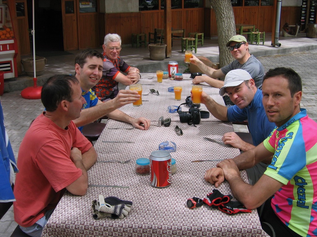 Nous partons directement de l’hôtel par des pistes puis par la route qui va vers Ürgüp. Bernard, qui a un peu sa dose de chemin technique, préfère rester à l’hôtel : Ensuite nous suivons une piste puis une route pour rejoindre le haut de la vallée rouge. Mehmet doit discuter longuement avec le gardien du péage pour ne pas nous refaire payer les 2.5 lires de droit d’entrée : Devant une vue magnifique, j’offre un verre de jus d’orange à tous le groupe. Le sentier ensuite est une pure merveille. Il passe à flanc de coteau au dessus des vallées Rouge et Rose et est globalement en descente. Nous faisons souvent des arrêts pour apprécier ce magnifique paysage. La fatigue, le relâchement ou tout simplement des erreurs d’inattention nous ferons faire à Bruno, Raphaël et moi quelques chutes sans gravité heureusement. Nous repassons par Çavusin. Un groupe de touriste nous acclame pour notre dernière descente. Nous nous arrêtons pour boire un pot au village. Après cet effort, la bière locale de ½ litres nous fera pas mal tourner la tête pour nos derniers kilomètres. En arrivant à l’hôtel nous donnons un petit coup de main à une tortue pour traverser l’avenue. Nous en aurons vu 4 ou 5 au total dans la semaine.