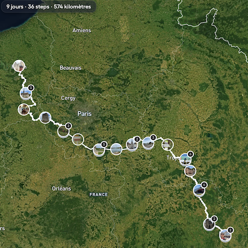 10/05/21 : Du lac d’Orient à Nogent sur Seine. Petit détour pour voir le moulin de Dosches. Visite rapide de Troyes. Pique-nique le long du canal de la Haute-Seine. Rencontre avec un pèlerin belge de 66 ans se rendant à St Jacques de Compostelle en 6 à 8 mois. Nuit au camping municipal de Nogent sur Seine, non loin de la centrale nucléaire.