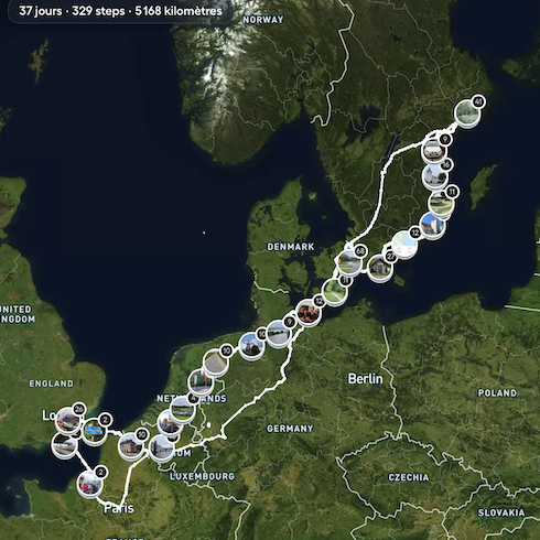 Je rejoindrais Londres en trains et ferry. J’estime le voyage à 2600km et demande donc 5 semaines de congés pour les réaliser. Je me réserve la possibilité de prendre un peu le train en Suède si je n’ai pas assez de temps ou si je trouve les paysages trop monotones.