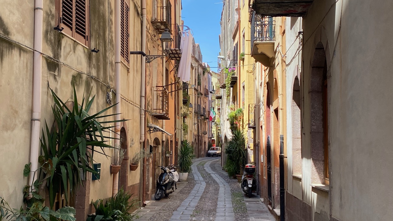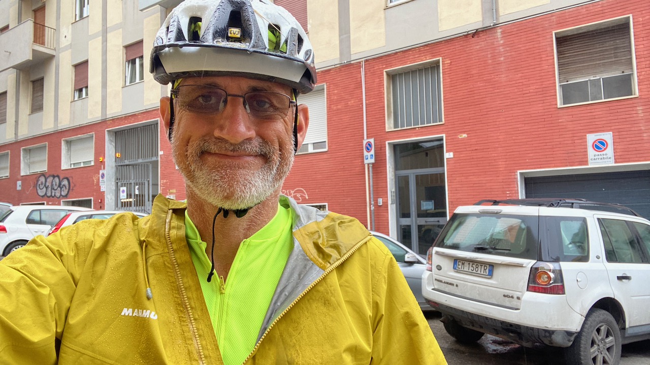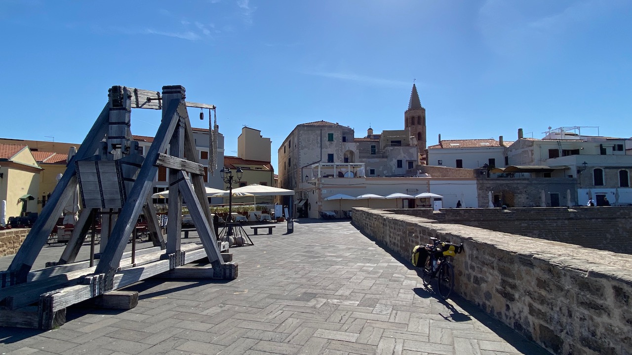 • L’arrivée sur Cagliari a été une belle galère. Les applications de navigation préconisent de faire un grand détour pour rejoindre en sécurité le centre-ville. Soit plus de 20km de plus qu’en voiture. Je suis ces détours jusqu’à l’aéroport d’Elmas puis tente le coup de couper court. Un petit passage de 500m sur une voie rapide me mène vers une petite route en cul de sac. Un chemin doit longer la voie ferrée jusqu’à Cagliari. Il n’est rapidement plus vraiment praticable à vélo. De l’autre côté d’un grillage que je ne peux pas franchir, je vois une belle piste qui suit la voie ferrée. Je continue ma galère alors que le chemin disparait dans de la végétation de bord d’étang. Soit je suis coincé par des roseaux, soit je dois marcher dans un bourbier d’étang à sec. La propriétaire du logement de ce soir m’envoie un message me demandant à quelle heure je pense arriver. Je n’en ai aucune idée ! Je ne suis qu’à 5km de l’arrivée mais cela pourrait prendre des heures vu ma situation.Je dois faire demi-tour lorsque je me rends compte que je tombe sur un canal infranchissable. Je trouve un canoé abandonné et envisage un moment le prendre pour franchir ce canal. J’y renonce et finalement et à mon grand soulagement, je trouve la piste que je voulais prendre. Mince, elle débouche sur une grille fermée à clé. Ouf ! je peux passer sur le côté. Mince encore, quelques kilomètres plus loin, une autre grille aussi fermée. Là je peux passer sur un côté mais il me faut démonter mes sacoches et porter le tout de l’autre côté. C’est tout crotté et fatigué que j’arrive enfin dans les rues de Cagliari. Gros ouf de soulagement !