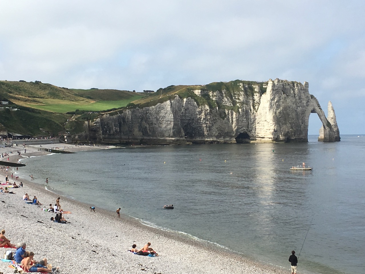 Après une bonne nuit et un bon petit-déjeuner, je reprends la route vers 9h15. La vélo route est très agréable, plate, avec de beaux paysages campagnards. A St Jouin-Bruneval, je descends voir la mer dans une 1ère cavée. Puis, c’est en hauteur que je vais avoir une vue sur la mer et le port pétrolier d’Antifer. J’arrive ensuite à Etretat qui est déjà bien envahie par les touristes. Quelle chance d’être en vélo et pas en voiture en ce jour, probablement le plus chargé de l’année. Je ne m’attarde pas trop sur place car je commence à bien connaitre le lieu. Grosse remontée pour passer par Bénouville puis je quitte temporairement la vélo route pour passer par Yport et la retrouve un peu avant d’arriver à Fécamp. Je m’achète un bon pique-nique dans une boulangerie (leur tarte aux pommes est un régal !) que je déguste à l’ombre car il commence à faire bien chaud. Petit détour ensuite pour passer devant le palais Bénédictine. Il faudrait que je fasse la visite de ce beau bâtiment et de l’usine de production de la fameuse liqueur. Belle vue sur Fécamp après une rude montée. Sur le plateau, le vent est de face ce qui n’est pas très courant mais heureusement ne me gêne pas trop. Je quitte bien souvent la vélo route pour passer au plus près de la côte mais je ne fais pas tous les détours dans chaque cavée car je sais que l’étape sera longue et déjà avec beaucoup de dénivelé. Ambiance très estivale à St Valéry en Caux où je déguste une glace, je pense bien méritée. Il est déjà 17h, et je me presse désormais pour rejoindre mes hôtes de ce soir du coté de Dieppe pas trop tard. Beaucoup de monde aussi à Dieppe et je dois me faufiler entre les voitures et même prendre quelques sens interdits pour ne pas perdre trop de temps. J’arrive à Grèges, non loin de Dieppe, chez les parents de Nicolas, un copain rencontré à Rouen grâce à Warmshowers. Il a notamment fait un demi-tour du monde Japon – France de 2.5 ans et en a fait un livre qu’il a déjà vendu à plus de 1000 exemplaires. Je suis accueilli par son père puis par lui-même et sa mère quelques minutes plus tard. Soirée sympa à discuter et à regarder les JO à la télé. Nicolas organise depuis 2 ans des voyages à vélos à Sumatra. Je serais assez tenté d’en faire un l’année prochaine. J’ai fait 145km et près de 1600m de dénivelé en 7h36 de vélo.