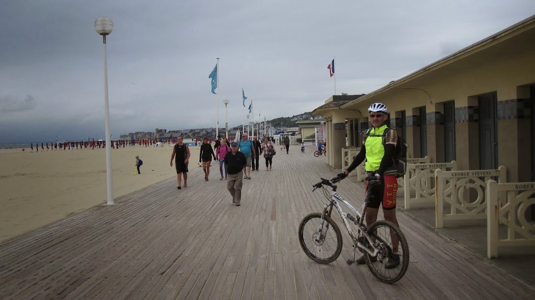 Après le pdj à l’hôtel, nous partons pour cette dernière étape. Le temps est gris et frais. Le premier chemin est galère car envahie par les ronces. Je me fais pas mal lacérer alors que Cyrille choisit plus intelligemment de passer par les champs d’à côté. On passe ensuite dans un beau secteur de haras, non loin de Beaumont en Auge. Belle vue sur la vallée de la Touques depuis le joli village. Direction ensuite le Mont Canisy que l’on gravit par une route. Mais pour la redescente, je choisis le seul sentier qui arrive directement aux portes de Deauville, au pied de l’hippodrome pour être précis. Nous rejoignons directement la plage. Cyrille tient beaucoup à rouler sur le sable dur de la plage. On rejoint ensuite les fameuses planches mais il nous faudra descendre de vélo pour les parcourir. Petit tour ensuite dans les rues ultra chics de Deauville. On se croirait dans les quartiers chics de Paris. Passage ensuite à Trouville pour attaquer une grosse montée bien raide et longue. Le sentier n’est pas facile pour rejoindre Villerville : Chemins boueux ou rocailleux, montées et descentes raides. Notre seule solution de restauration à Villerville est le SuperU ouvert même le Dimanche. Nous y faisons nos emplettes pour notre pique-nique que nous mangerons protégés des gouttes qui commencent à tomber. De par mon expérience de mon dernier passage ici, je calcule que nous devrions pouvoir arriver au Havre à temps pour prendre le train de 16h11. Mais il nous reste quelques belles côtes. Au terme de ces 3 jours, nous sommes bien fatigués : mal au fesse pour tous les deux, aux genoux pour moi et cuisses bien endolories. Nous essuyons nos premières averses en arrivant sur Honfleur. Beaucoup de monde malgré tout autour du port dont nous faisons le tour. Nous rejoignons le Pont de Normandie avec pour une première fois le vent dans le dos. La montée n’est pas facile avec le vent désormais de travers. Il faut faire gaffe aux embardées que l’on pourrait faire soit vers les voitures soit vers le trottoir des piétons. De l’autre côté du pont, c’est une ligne droite interminable, vent de face qui nous attend. Nous roulons l’un derrière l’autre à tour de rôle. L’arrivée sur le Havre se fait par des coins du port pas très chouettes. 2 kms avant d’arriver, Cyrille casse la structure de sa selle. Il ne peut plus s’assoir dessus. Heureusement que cela lui arrive si proche de l’arrivée. Cela aurait été bien plus embêtant si cela était arrivé bien avant. Nous arrivons un peu avant 16h donc juste ce qu’il faut pour prendre notre train de retour.